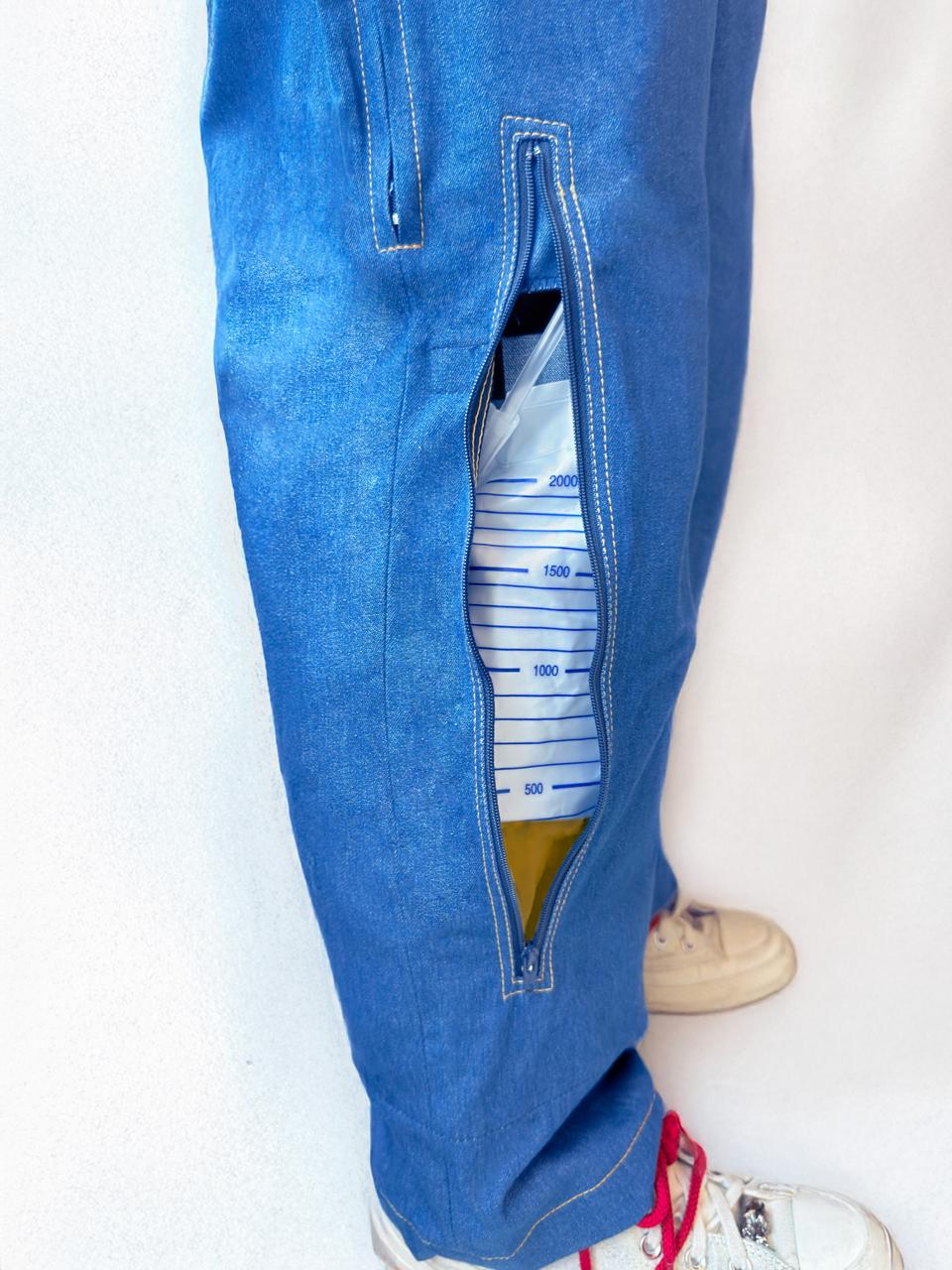 直身褲腳,小腿旁設有拉鏈位,方便放尿,尿袋可隱藏褲內。